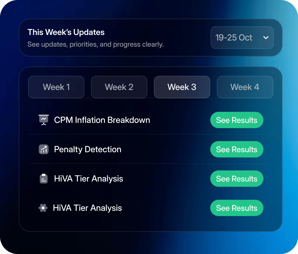 Meta tracks dozens of backend signals that influence CPMs, delivery, and scalability. Our diagnostic assessments decode those internal trust metrics, giving you full visibility into what's really controlling your ad results.